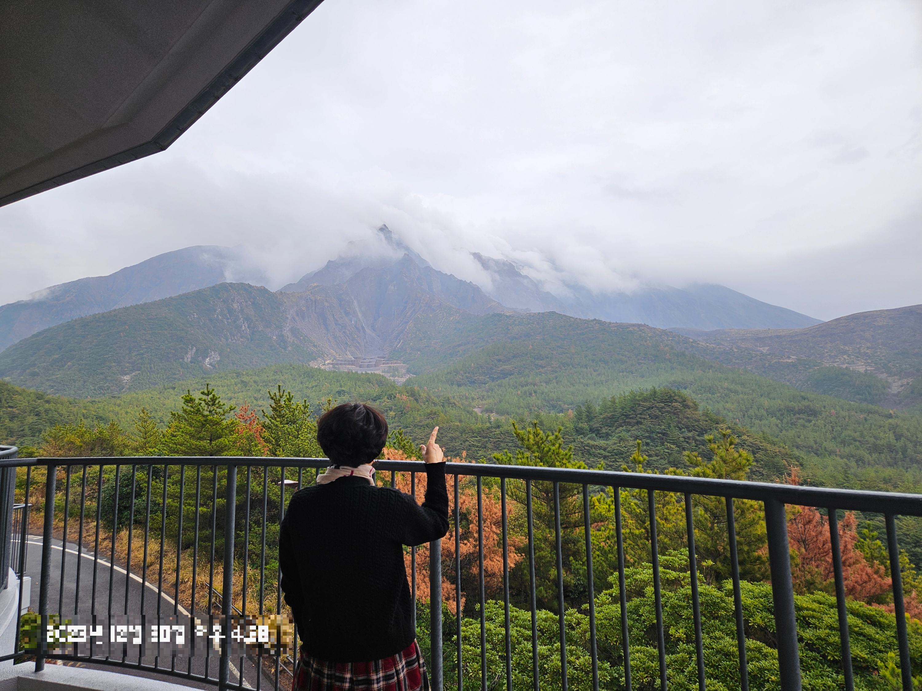 버스를 타고 드디어 도착했습니다. 사쿠라지마 쇼와 화구에 가장 가까운 쿠로카미 전망대! 그런데 날씨가 흐리고 비도 가끔 내립니다. 어쩔 수 없죠..ㅜㅜ 전망대에 올라가 망원경을 보니 용암 산기슭이 보입니다. 이 시간에는 분화를 하지 않네요. 안개 자욱하고 조용한 사쿠라지마를 뒷 배경으로 사진 찍고 내려왔습니다.