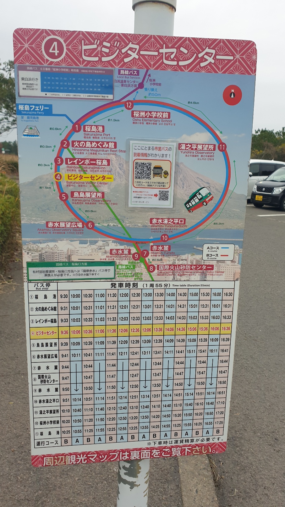 족욕을 마치고 이제는 사쿠라지마 용암을 보러 갑니다. 여기서는 버스를 타고 가야 합니다. 일본은 교통이 정말 잘 되어 있어 자유여행하기 좋은 곳입니다. 더욱이 버스시간까지 아주 정확합니다. 안내표지판에 적힌 시간에 정확히 버스는 도착했습니다. 승용차가 아닌 대중교통을 이용하니 다소 시간이 소요되긴 합니다. 저희는 이걸 이용했어요. 입장료, 버스, 배 등 여러 곳에서 이용 가능해서 편리했습니다