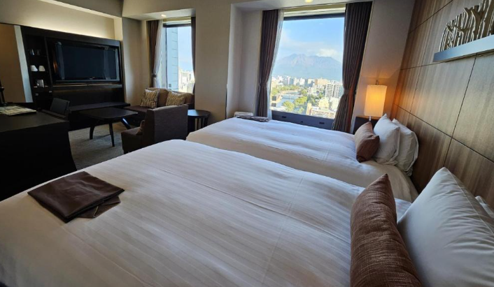 오전엔 센간엔, 오후엔 사쿠라지마, 저녁엔 덴몬칸까지의 아주 아주 알찬 일정을 마치고 드디어 숙소로 갑니다. 숙소는 가고시마 중앙역에서 2분 거리로 바로 정면에 있습니다. '솔라리아 니시테츠 호텔 가고시마'는 2012년 개장한 호텔로 프랑스 레스토랑을 운영하며 4성급 장식으로 꾸며진 호텔로 현대적인 객실과 넓은 샤워실과 욕조를 갖추고 있습니다. 솔라리아 니시테츠 호텔에 관한 자세한 정보를 원하시면 바로 가리를 추천합니다