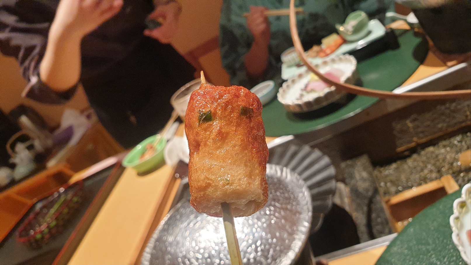 음식 하나하나가 색깔이며 모양이 정말 그냥 만들어진 게 없더라고요. 이제는 슬슬 어묵으로 가볼까요? 일본 하면 또 어묵요리가 다양하고 맛도 최고입니다. 가이세키에서 여러 가지 어묵이 나왔는데요. 그중에서도 역시 즉석요리가 최고입니다. 하얀 어묵이 튀김에 이렇게 노릇노릇하게 튀겨졌습니다