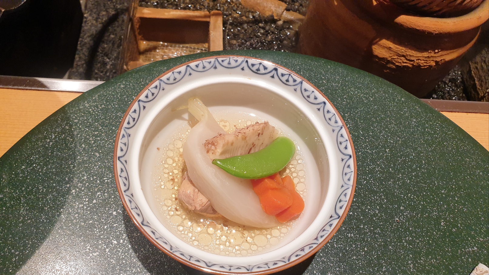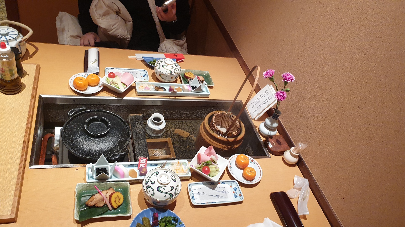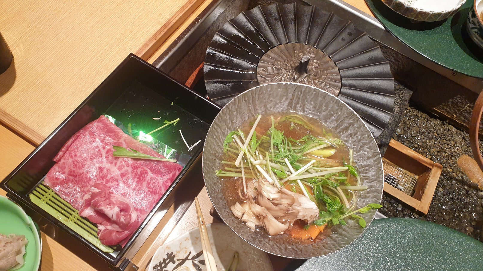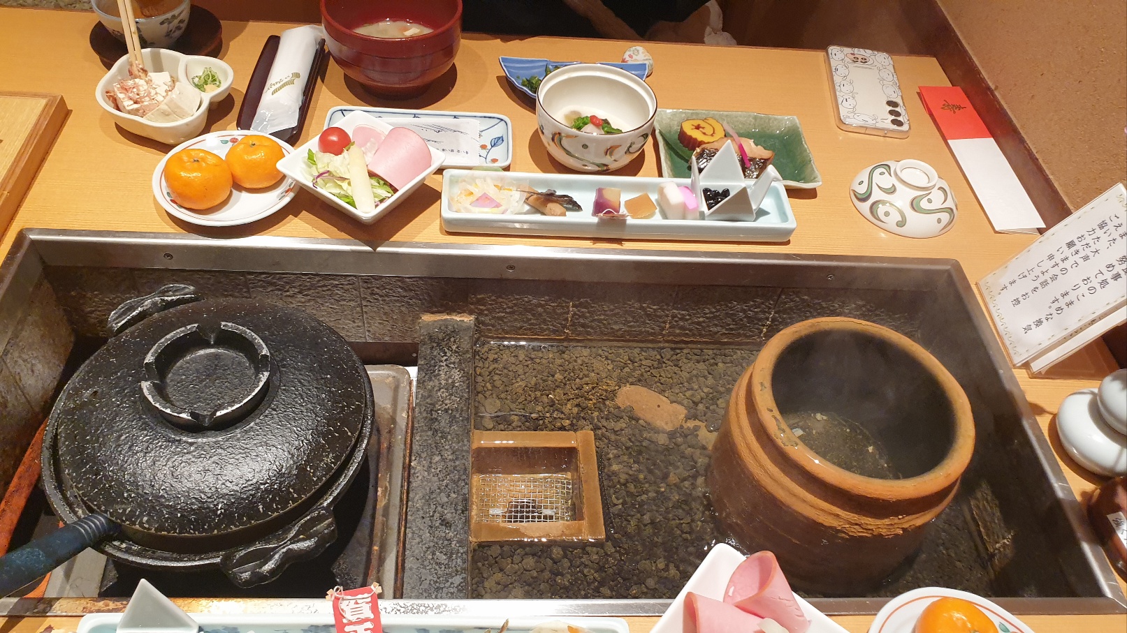 가이세키 요리의 하이라이트입니다. 즉석요리!! 식사를 하고 있는 중에 또 다른 음식이 옆에서 요리되고 있는 모습을 보면서 식사를 즐깁니다. 이 물은 대부분 온천수입니다. 계란을 삶기도 하고요. 옆에 있는 검은 그릇은 튀김 종류를 할 수 있는 그릇입니다.