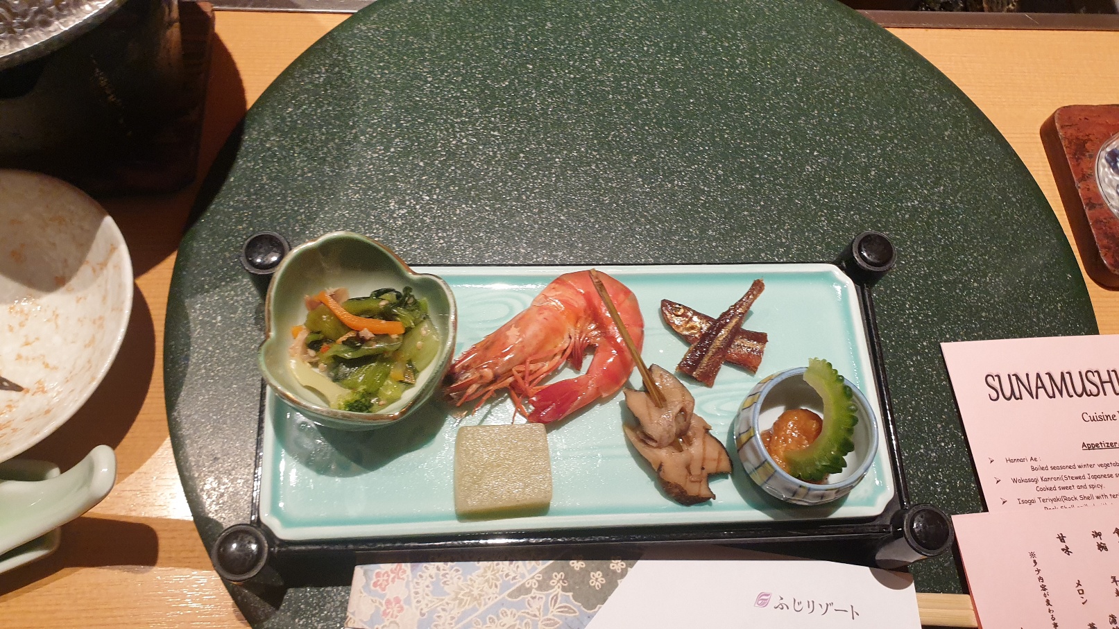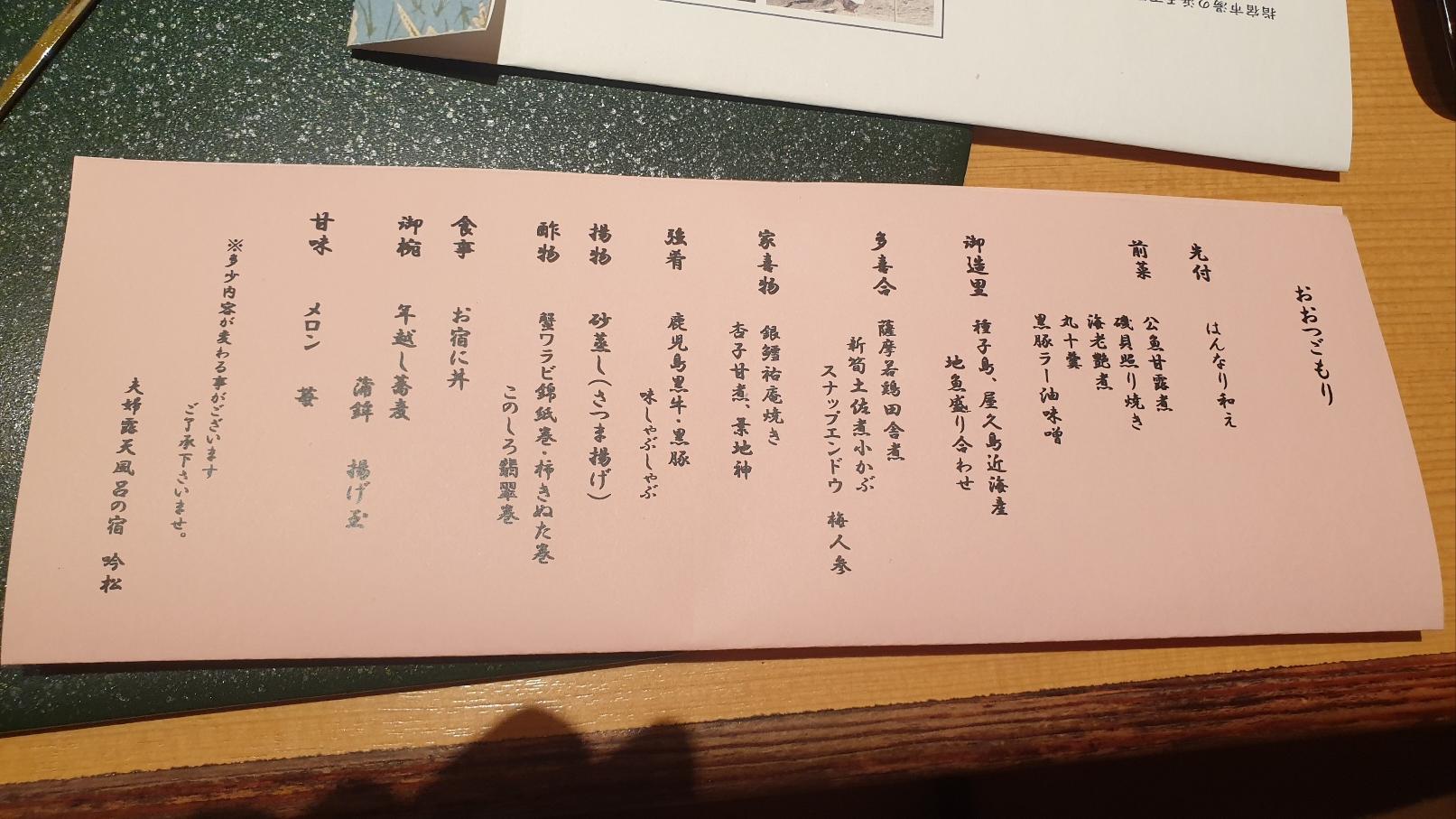 저희는 2인이라 작은 룸으로 되어 있었습니다. 내부는 깔끔하고 아늑했어요. 그리고 음식을 마칠 때까지 서빙해 주시는 분이 친절하게 도와주셔서 너무 편하고 기분이 좋았습니다. 아래는 음식 메뉴판 같아요. 가이세키 요리가 워낙 음식의 종류가 많다 보니 그 음식의 내용들을 적어 놓은 것입니다. 딸이 하나하나 짚어가며 이 음식이 이것이고, 어떤 음식은 아직 나오지 않았다고 설명해 주었습니다. 저는 완전 까막눈이라 하얀 것은 종이 까만 것은 글씨라는 것만 보였습니다. ㅎㅎ