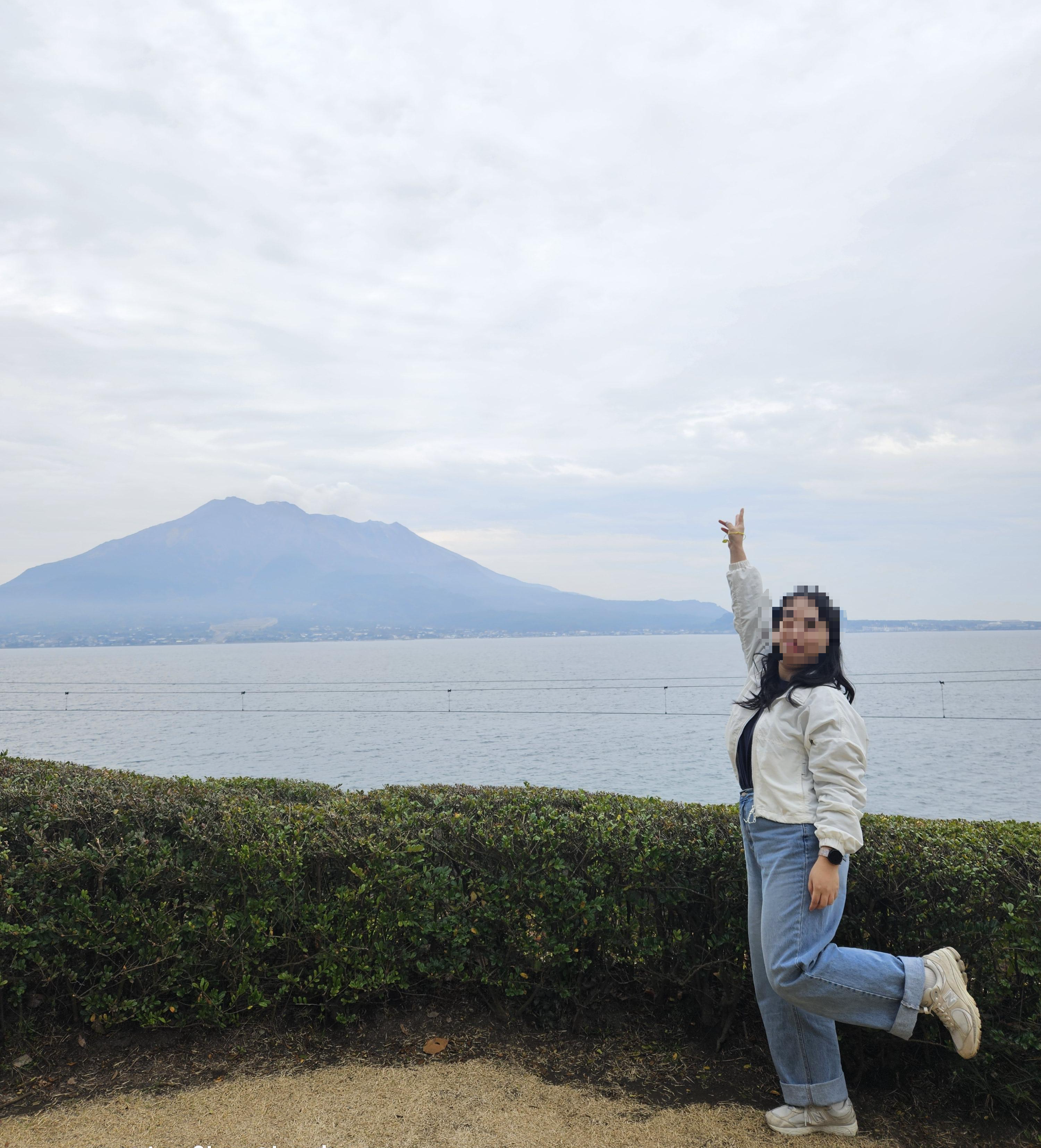 센간엔에서 매일 분화하는 사쿠라지마를 가까이 볼 수 있습니다. 물론 저희는 오후에 배를 타고 사쿠라지마에 더 가까이 갈 예정입니다. 이곳에서 딸이랑 사진을 찍었습니다. 매일 분화하는 활화산 아래 마을에서도 사람들이 평온하게 생활한다는 게 신기하기도 했지만 재해에 대한 여러 가지 대비가 잘 되어 있다고 합니다